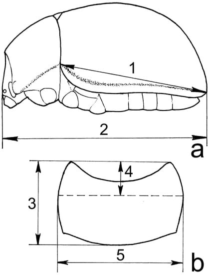 2. Size of the pronotum (a): pronotal length (in dorsal view)/elytral length (in lateral view) (Figure 2: 1, 3).