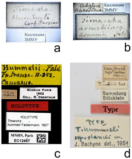 A specimen T. hummelii in MNHN is supplied with three historical labels: “Hummelii Fald Fn. TRANSC. II—352. Caucasus”, “Ex Musaeo Mniszech”, and “Museum Paris 1952 Coll. R. Oberthur” (Figure 3c and Figure 4a). Moreover, this specimen bears four recent labels, including two “holotype” labels.
