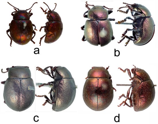 - Medvedev, L.N.; Shapiro, D.S. Chrysomelidae—Leaf-Beetles. In Key to insects of European part of the USSR, 2nd ed.; Nauka Publications: Moscow-Leningrad, Russia, 1988; pp. 419–474. (In Russian) [Google Scholar]