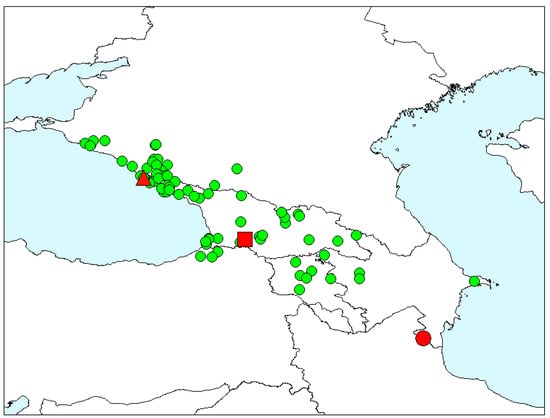 Timarcha hummelii, material examined. Red figures—type localities of the nominal taxa: triangle—T. hummelii starcki, square—T. armeniaca, circle—T. hummelii. Green circles—non-type specimens.
