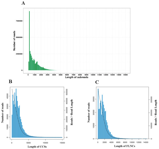 SMRT sequencing of B. dorsalis transcriptomes. (A) Length distribution of subreads. (B) Length distribution of CCSs. (C) Length distribution of FLNCs. Note: The left ordinate represents the number of sequences of this length, and the right ordinate represents the number of sequences whose length is greater than a certain value (X-axis).