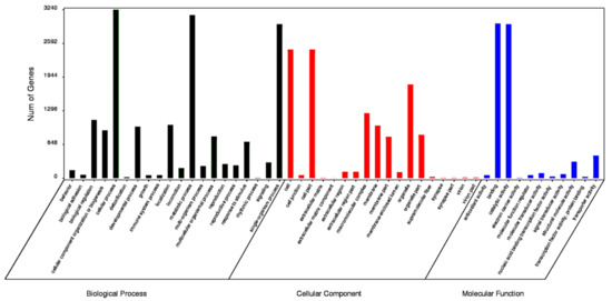 A reference genome (ncbi_GCF_000789215.1) sequence was used to measure the accuracy of the generated Iso-Seq reads. Then, we mapped the corrected high-quality consensus sequences to the reference genome with GMAP [34], and redundant transcripts were collapsed with a minimum identity of 95% and minimum coverage of 99%. We compared the finally obtained isoforms with the reference genome annotation and then classified them into three groups: known, novel, and new isoforms. The new isoforms were BLAST analyzed against the NCBI non-redundant protein (Nr) database (http://www.ncbi.nlm.nih.gov, accessed on 1 October 2019), Swiss-Port protein database (http://www.expasy.ch/sprot, accessed on 1 October 2019), and the Kyoto Encyclopedia of Genes and Genomes (KEGG) database (http://www.genome.jp/kegg, accessed on 1 October 2019) with the BLASTx program (http://www.ncbi.nlm.nih.gov/BLAST/, accessed on 1 October 2019) at an E-value threshold of 1e−5 for the evaluation of their sequence similarity with the genes of other species and investigation of their functions. Gene Ontology (GO) annotation was analyzed with the Blast2GO [35] software with the Nr annotation results of the isoforms. We selected the isoforms that were not shorter than 33 high-scoring segment pair hits to conduct the Blast2GO analysis and then used WEGO software to perform functional classification of isoforms [36].