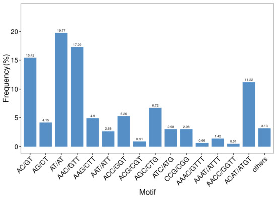 Among all of the SSR repeat types, AT/AT dinucleotide repeats repeated the most, accounting for 19.77% of all repeat motifs, followed by AAC/GTT (17.29%) and AC/GT (15.42%) (Figure 4). Furthermore, trinucleotide repeats contained the most repeat types—up to 38—and the main repeat types consisted of AAC/GTT (17.29%), AGC/CTG (6.72%), and ACC/GGT (5.26%). The following tetranucleotide repeats also included 35 repeat types. As shown in Table 5, the highest number of identified SSRs were trinucleotide repeats (875, 44.24%), followed by dinucleotide repeats (779, 39.38%) and tetranucleotide repeats (302, 15.27%). The rarest type of EST-SSR was the pentanucleotide type (0.46%), but not the hexanucleotide type (0.66%).