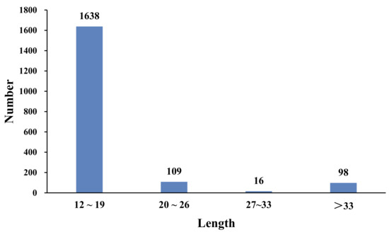 Among all of the SSR repeat motif lengths, the lengths ranged from 12 to 190 bp. A total of 1638 SSRs were mainly concentrated in the 12–18 bp region (88.02%), 109 SSRs were 20–26 bp long (5.86%), 16 SSRs were 27–33 bp long (0.86%), and 98 SSRs were longer than 33 bp (5.27%) (Figure 5).