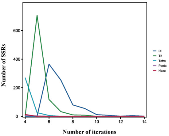 As for SSR tandem repeats, the most common tandem repeat number was 5 (735, 37.16%), followed by 6 (490, 24.77%) and 4 (288, 14.56%). Furthermore, the motif repeats of 1952 SSRs were less than 9, accounting for 98.69% of all identified SSR loci (Figure 6).