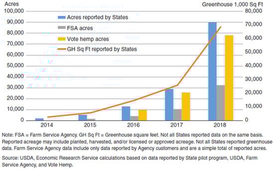 United States hemp acreage and greenhouse area, reported 2014–2018. Graphic is from Tyler et al. [7].