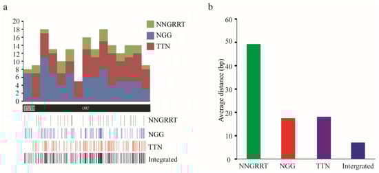 Comparative analysis of CRISPR targeting sites on Amyellow-y mRNA: (a) numbers and distributions of targetable sites on Amyellow-y mRNA. The different colours of the top panel indicate the number of different CRISPR target sites. The X-axis indicates the position on Amyellow-y mRNA, and the Y-axis represents the numbers of targeted sites. The middle panel presents the schematic diagram of the Amyellow-y mRNA structure. The Bottom panel is the sketch map of sites distribution. Each line indicates one target site; (b) the average distance between two adjacent sites of different CRISPR systems along Amyellow-y mRNA. The X-axis represents the PAM types, and the Y-axis represents the average distances.