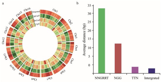Bioinformatics analysis of CRISPR targeting sites on A. mellifera chromosome: (a) distribution of different target sites’ position on a chromosome. The red and green colour indicates high density and low density of CRISPR sites, respectively; (b) the average distance of two adjacent sites along the whole chromosome.