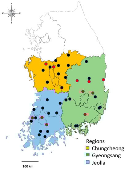 Study area, including tick collection sites in the central and southern regions of Korea (March–July 2021). Three study regions are indicated by different colors based on the administrative district boundaries (Chungcheong, yellow; Gyeongsang, green; Jeolla, blue). Tick collection sites are indicated by black circles, and sites PCR-positive to Borrelia by red circles.