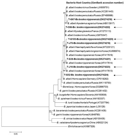 Ticks are ectoparasites that feed on humans as well as wild and domestic animals. Ticks are also a vector for spreading viruses and protozoa, as well as bacteria, e.g., Borrelia, Coxiella, or Rickettsiales [1,2]. Lyme borreliosis is also a tick-borne zoonotic disease. The disease is caused by the spirochete (causative agent) and the most common mode of transmission is via tick bite [3,4]. Although the taxonomy of the Borreliaceae family (genus Borrelia) has recently been revised into two genera, Borrelia (causing relapsing fever) and Borreliella (causing Lyme disease), this change has been challenged [5]. The Borrelia burgdorferi s. l. genospecies currently consists of 20 accepted and three proposed genospecies [6], and seven species (Borrelia afzelii, B. garinii, B. japonica, B. tanukii, B. turdi, B. sinica, and B. valaisiana) have been identified in Asia. Of these, B. afzelii and B. garinii are known to be pathogenic to humans. [4]. The main vectors of Lyme borreliosis are the ticks of the genus Ixodes and the main species in Asia are Ixodes persulcatus and I. nipponensis [7,8]. After B. burgdorferi s. l. was first identified in Korea in 1993, a human Lyme borreliosis case also occurred during the same year. The incidence has increased since then [4,7]. In Korea, on average, 15.4 cases per year have been reported in the past decade, with 23 cases reported in 2019 and 18 cases reported in 2020 [9,10]. In Korea, research on Borrelia is currently being carried out on the pathogenicity of various wild animals, including ticks, rodents, and companion animals [3,7,11,12,13].