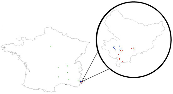 Map of the strains used this study. Left: overall view. Right: zoom of the French department, “Alpes-Maritimes”. The three strains’ origins are visualized as follows: meso-editerranean in red, supra-Mediterranean in blue and northwestern in green.