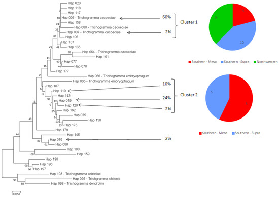 This molecular characterization aims at discarding the existence of cryptic species that are frequent in Hymenopteran species [38,39,40,41] as well as the hypothesis of a phylogeographic process [37,42,43]—for instance, divergences at the molecular and phenotypic levels in an allopatric context followed by, after the expansion of some lineages, a secondary contact—that would better explain the observed patterns in thermal biology than processes of local adaptations. To achieve these goals, the mitochondrial gene cytochrome c oxidase subunit 1 (COI) was used for similar work (see [35,38]). It is worth noting that, T. cacoeciae being thelytokous, there is no genetic mixing including mito–nuclear introgression.