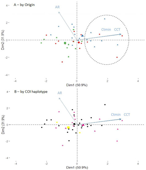 To further investigate possible covariations between these three traits, a principal component analysis (PCA) was performed on normalized data, the first two axes explaining 83% of the variability (Figure 5). Most of the variability on the first axis was explained by the positive correlation between CTmin and CCT while most of the variability on the second axis was explained by the AR. Within this phenotypic space, both the meso- and supra-Mediterranean strains appeared to be more variable than the Northwestern ones. In particular, 29% of the meso-Mediterranean strains and 44% of supra-Mediterranean ones exhibited high values on the first PCA axis (see dotted ellipse on Figure 5A). Such high values were not encountered in the northwestern strains. As shown in Figure 5B, differences in phenotypic performances did not depend on the COI haplotypes.