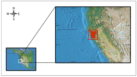 Location of Mendocino County (red square), which is situated in northern California and approximately 160 miles (257 km) north of the city of San Francisco and 280 miles (450 km) south of the state of Oregon.