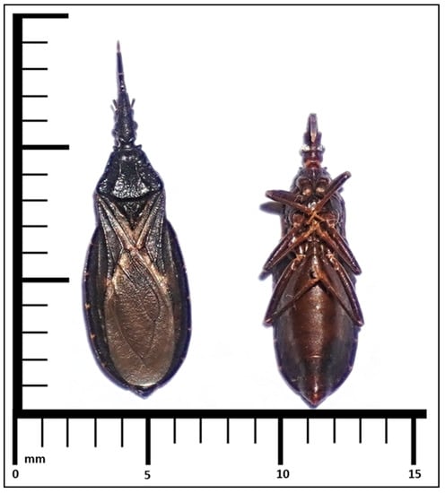 - Thurman, D.C.; Mulrennan, J.A.; Basham, E.; Taylor, D.J. Key to Florida Triatoma with Additional Distribution Records for the Species (Hemiptera, Reduviidae). Fla. Èntomol. 1948, 31, 57. [Google Scholar] [CrossRef]