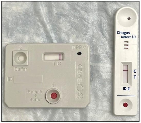 Rapid diagnostic tests for Chagas disease (left—DPP® Chagas System; right—Chagas Detect™ Plus) performed in the clinic revealed negative results (T with absent line in both tests).