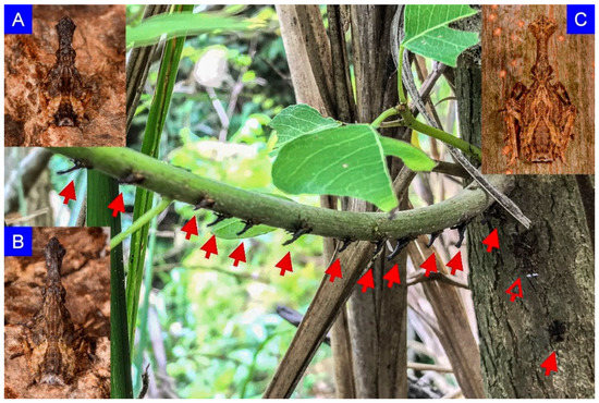 In this study, the neighboring trees or the trees around the investigated plants were also observed. We found that all plants with immature stages of P. candelaria were in the vicinity, probably within flight distance of adults, of longan trees. Moreover, except for Acacia confusa and Sapium discolor, the plants with nymphs were next to or even in the shade of T. sebifera. The nymphs might walk or even directly fall from nearby T. sebifera onto other plants. Kim et al. [7] indicated that the nymphs of the spotted lanternfly often fell to the ground because of wind, but then ascended the trees again.