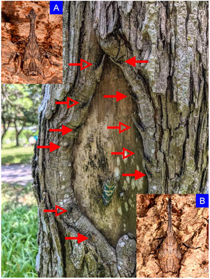 The nymphs of Pyrops candelaria may move to the lower part of the trunk in July. In this photograph, six fourth instars (A) and five fifth instars (B) were circling a newly emerged adult on the trunk of Triadica sebifera. The form and color of the nymph are cryptic, and like the remnants of broken twigs and barks. Each arrow points to a nymph. The fourth and fifth instars were indicated by solid and hollow arrows, respectively.