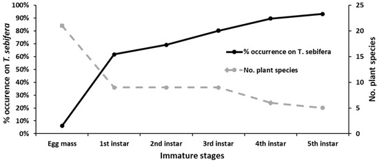 To see if the host plant preference shifted, we calculated the percentage of the occurrence of egg masses and each nymphal instar on Triadica sebifera. As seen in Figure 3, a trend in the host preference toward T. sebifera was increasingly apparent with developmental stage from eggs (6.1%) to the fifth, final nymphal instar (93.1%). Another index in Figure 3 was the number of plant species recorded with >0.5% of egg masses or all nymphal instars, to show whether the range of host plant species was narrow or broad in each developmental stage. A broad range (21) of plant species for egg masses was recorded. However, only a few plant species (nine) were hosts for the younger (first to third) instars, and less than six species were recorded as host plants for the older (fourth to fifth) instars. Hence, the range of host plant species became narrower, with developmental stages from eggs to the last nymphal instar.