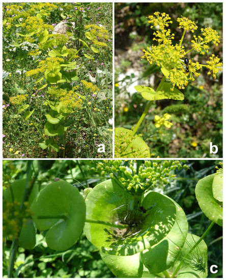 The round-leaved Alexanders S. rotundifolium Mill., also treated at the rank of the subspecies under S. perfoliatum (S. perfoliatum subsp. rotundifolium (Mill.) Hartvig) [23] or even as a variety (S. perfoliatum var. rotundifolium (Mill.) Fiori) [24], is an erect, branching perennial [25] of 30–60 cm height, with a ridged, but wingless, not hollow stem and broadly oblong, divided (biternate), green lower (basal and in the lower stem portion) leaves (Figure 1a). Bright, rounded upper leaves, being actually the bracts, have more or less entire margins, are sessile and clasp the stem (Figure 1c). Tiny yellow flowers assembled in branched umbels, which have up to 12 rays (Figure 1b), are produced in late spring and early summer (description after [26,27]). The plants are common in olive groves, thickets and in dry locations [26] and occur in the central and eastern Mediterranean regions at an elevation of up to 800 m [28]. No specialized ant species associated with S rotundifolium has been reported so far.