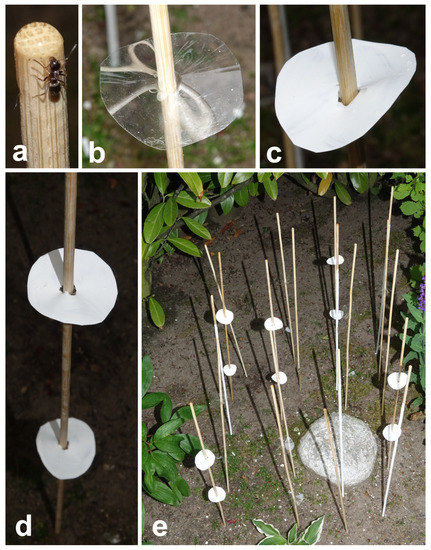 For the experiment with ants, instead of native plant stems of S. rotundifolium, we used dry wooden sticks (50 cm long, 0.3 cm in diameter, with grooved surface; Gardol Splittstab; BAHAG AG, Mannheim, Germany) dug to a 5 cm depth into the soil. We prepared four types of sticks mimicking different types (i.e., having diverse morphologies and surface textures) of plant stems: (1) intact, untreated sticks; (2) sticks painted with slaked, or hydrated, lime, thereby imitating plant epicuticular wax coverage; (3) untreated sticks with smooth plate-shaped cuffs imitating upper leaves (Figure 2b); and (4) untreated sticks bearing cuffs painted with slaked lime (Figure 2c). The cuffs were prepared in the following way: discs (ca. 5 cm in diameter) with a small hole in the center were cut out from the transparent polyester film (color laser transparency film 5752341, 125 μm thick; Office Depot, La Venio, the Netherlands) and firmly attached to sticks at the heights of 15 and 30 cm from the ground level (two cuffs per stick) (Figure 2d). To get wax-mimicking coverage on the surface, we painted sticks/cuffs with slaked lime (calcium hydroxide Ca(OH)2, Art-Nr. KK03.1; Carl Roth GmbH, Karlsruhe, Germany) dissolved in double-distilled water in the ratio 1:1 (lime to water). After drying under air conditions (in the presence of carbon dioxide CO2), the limewater resulted in the formation of a micro/nanostructured layer of calcium carbonate (CaCO3) on the surface.