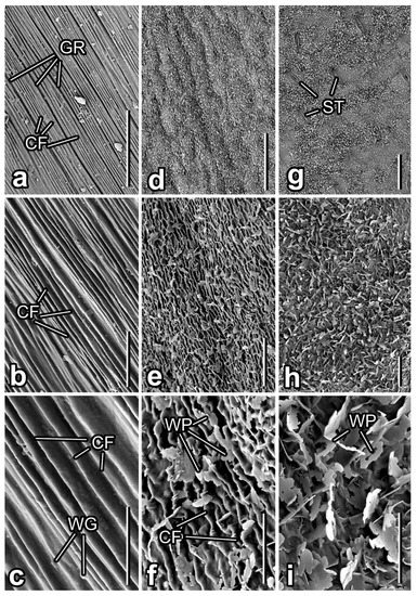Surfaces of different organs in the Smyrnium rotundifolium plant (cryo-SEM). (a–c) Flower stem. (d–f) Upper (adaxial) leaf side. (g–i) Lower (abaxial) leaf side. Abbreviations: CF—cuticular folds; GR—grooves; ST—stomata; WG—wax granules; WP—wax platelets. Scale bars: 50 µm (a,d,g), 10 µm (b,e,h), 5 µm (c,f,i).