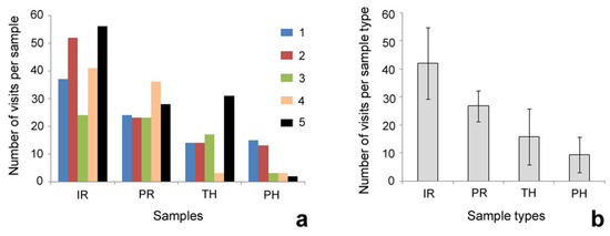 Number of ant visits per sample (a) and per sample type (mean and SD) (b). Abbreviations: IR—intact sticks; PH—sticks with painted (i.e., bearing calcium carbonate coverage) cuffs; PR—painted sticks bearing calcium carbonate coverage; TH—sticks with unpainted, transparent cuffs; 1, 2, 3, 4, 5—different individual sticks in each sample type.