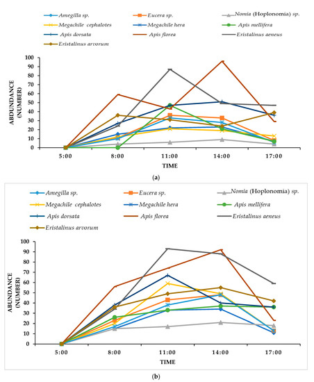 Moreover, visitation rate (numbers of raceme visited/60 s) and stay time (the time spent per single raceme) of insect pollinators was also recorded. Weekly observations were carried out at 8:00, 11:00, 14:00 and 17:00 h, since different insects had different diurnal dynamics [55,56,57,58].