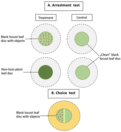 The experimental set-up was similar to that described by [22]. Leaf discs were cut off the leaf blade, avoiding the main veins. In the tests using objects, we took two leaf discs from each black locust leaflet. They were cut off a leaf blade on the opposite sides of a main vein. One disc was used for the control and the second one with the particular kinds of objects for a treatment combination. By contrast, in the ‘non-host plant’ test, the leaf disc cut from the old non-host leaf was a treatment combination, while that from the old black locust leaflet was a control.