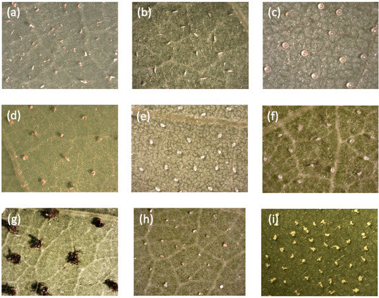 Microphotographs of various objects placed on black locust leaf discs in the tests: (a) pierced adults of A. allotrichus, (b) intact quiescent nymphs of A. allotrichus, (c) eggs of the two-spotted spider mite, (d) pierced larvae of the two-spotted spider mite, (e) eggs of the mould mite, (f) pierced larvae of the mould mite, (g) injured larvae of the cowpea aphid, (h) sand grains, and (i) aggregations of cattail pollen.