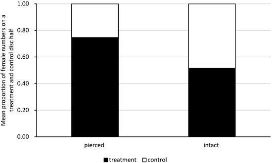 Site preference of single females on the old black locust leaf when given a choice between a leaf disc half with pierced or intact conspecifics (treatment) and the clean half of the leaf disc (control). Estimated on the basis of the pooled data on the first females’s choice and consecutive examinations of females’s presence on each disc half at one-minute intervals, throughout the subsequent 30 min from the moment of the females’s first choice.