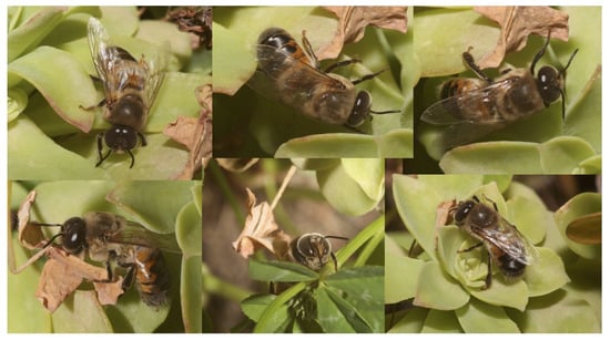Recently, the activity of A. mellifera drones was monitored during their entire life in spring and summer using an optical bee counter placed at the entrance of the hive [15]. Drones were active in the afternoon, and most flights occurred from 14:00 to 18:00. Short orientation flights occurred when drones were 6–9 days old, and mating flights of about 30 min occurred from 21 days of age on in spring and from 13 days of age on in summer [15]. Drones, similarly to the queens, do not collect food, but when stimulated by workers through vibration signals [16,17], they can perform trophallaxis. Moreover, drones can participate in the thermoregulation of the nest by heat production [18,19]. Before reaching sexual maturity, drones can also make orientation flights around the nest [7,20], usually in the afternoon, to learn the features of the landscape that allow them to go back to the nest [8,21,22].