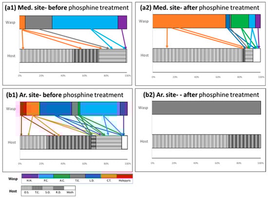 Wasp and host abundance (%) at the (a) Med. site and the (b) Ar. site (1) before and (2) after the application of phosphine. Arrows indicate on parasitoid wasp- host interaction based on Table 1. OS—Oryzaephilus surinamensis; SO—Sitophilus oryzae; TC—Tribolium castaneum; RD—Rhyzopertha dominica; Moths: Plodia interpunctella and Ephestia cautella. Wasps: CT—Cephalonomia tarsalis, Hol.—Holepyris sp., HH—Habrobracon hebetor, LD—Lariophagus distinguendus, PC—Pteromalus cerealellae, TE—Theocolax elegans, AC—Anisopteromalus calandrae.