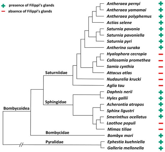 The Filippi’s glands (FGs), formerly “Lyonet’s glands”, are paired accessory organs associated with the silk glands. They are unique to Lepidoptera caterpillars and their exact role is not clear. The FGs are thought to be involved in the construction of a silk cocoon in bombycoid moths. FGs can differ in size and shape, therefore, in this study we attempt to find a correlation between FG morphology and phylogenetic position within the Bombycoidea. We use light and electron microscopy to examine the presence and morphology of FGs in a range of wild (giant) silk moths and several related species. Our results confirm that the majority of studied silk moth species have complex type of FGs that continuously increase in size during larval development. We identified several species of giant silk moths and two hawk moth species that completely lack FGs throughout their larval development. Finally, in several hawk moth species in which FGs are well developed during the first larval stage, these glands do not grow and remain small during later larval growth. Our results suggest that FGs are not critical for spinning and that loss of FGs occurred several times during the evolution of saturniids and sphingids. Comparison of FGs in different moths is an important first step in the elucidation of their physiological significance.