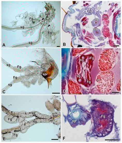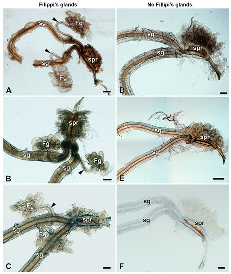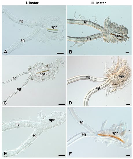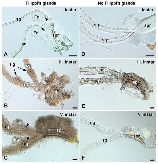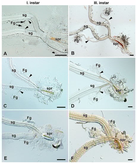 Spinning apparatuses with Filippi’s glands in Saturniidae larvae of the first and third instars. (A,B) The Polyphemus moth, Antheraea polyphemus. In (A), the FGs are shown by arrows. (C,D) The Indian moon moth, Actias selene. (E,F) The small emperor moth, Saturnia pavonia. The arrowheads indicate the ducts of the FGs entering the lumen of the SGs. Abbreviations: Filippi’s gland (Fg), silk gland (sg), and silk press of the spinning apparatus (spr). Scale bars: 100 µm.