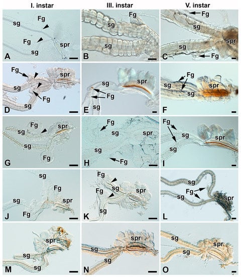 Development of spinning apparatuses of Sphingidae, first, third, and fifth larval instars. (A–C) Bedstraw hawk moth, Hyles gallii. (D–F) Death’s-head hawk moth, Acherontia atropos. (G–I) Privet hawk moth, Sphinx ligustri. (J–L) The eyed hawk moth, Smerinthus ocellatus. (M–O) The poplar hawk moth, Laothoe populli. The FGs are shown by arrows. The arrowheads indicate the ducts of the FGs entering the lumen of the SGs. Abbreviations: Filippi’s gland (Fg), silk gland (sg), and silk press of the spinning apparatus (spr). Scale bars: 50 µm.