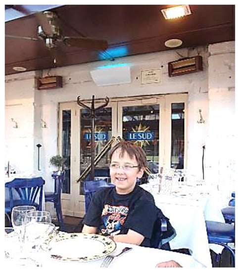 Traps with ultraviolet (UV) light are widely used for management of house flies in indoor urban and agricultural situations [17]. Some of the first traps had wire grids located in front of the UV fluorescent tubes to electrocute flies that were attracted to the lights [17]. It was noted [18,19] that flies killed by contacting the wires could fall beneath the trap; flies could also be blown away from the trap by the force of the electricity in the grid. Pickens [18] calculated the distances that electrocuted flies could be blown away from the trap. These findings clearly restricted the placement of these traps near food preparation areas where passive, non-toxic fly management is required. Additional research demonstrated that electrocution not only blew visible fly particles away from traps, but also caused the production of small airborne particles which could be potentially contaminated with pathogens such as bacteria and viruses [17,19,20]. This led to the development of UV light traps with glue boards to capture flies on sticky surfaces rather than fragmenting them through electrocution [20]. The significance of particle and pathogen dispersal from flies by the force of electrocution is not recognized internationally, and in many countries outside of the U.S. electrocutor grid traps can be seen mounted directly above food preparation areas (J.A.H., unpublished data) (Figure 2).
