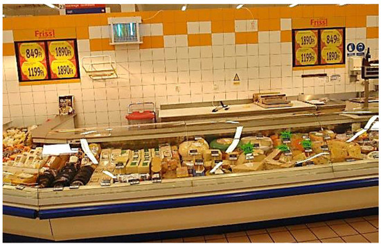 Supermarket meat and cheese counter with preparation area next to the wall and an electrocutor grid trap overhead, Budapest, Hungary.