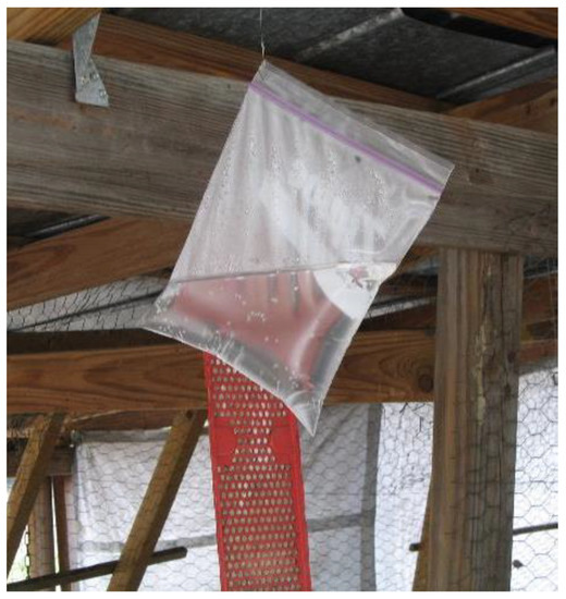 - Stringham, S.M.; Watson, D.W.; Parsons, J.; Carver, D.K.; Wineland, M. Suppression of house flies (Musca domestica) in egg handling rooms of broiler breeder farms using Fly Fright™ bags as an optical repellant. In Proceedings of the 48th Annual Livestock Insect Workers Conference, Lake Placid, NY, USA, 27–30 June 2004. 3p. [Google Scholar]