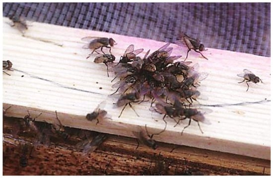 - Pickens, L.G.; Morgan, N.O.; Hartsock, J.G.; Smith, J.W. Dispersal patterns and populations of the house fly affected by sanitation and weather in rural Maryland. J. Econ. Entomol. 1967, 60, 1250–1255. [Google Scholar] [CrossRef]