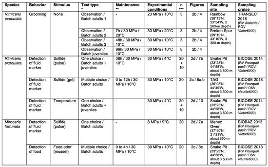 Species collection and experimental condition for behavioral experiments at in situ pressure. * Type of test applied either to a batch of shrimp or to single specimens; ** duration and condition of maintenance in pressurized aquaria before the experiment; *** number of shrimp for each experiment (some experiments were performed several times, see figure legends for more information).