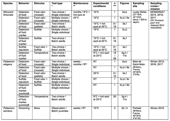 Ecological studies often suggest that the distribution of vent fauna is related to food availability or environmental characteristics, such as temperature and chemical conditions [48,49,50,51,52]. This implies that the vent fauna can detect food sources and environmental cues to locate the vent sites and select their microhabitat. Food-related odors might be major attractants for the scavenger species Mirocaris fortunata [50], while odors and features related to vent fluids might be more relevant to the species Rimicaris exoculata, which relies on symbiosis with chemosynthetic bacteria for its nutrition (see [53] for review). However, the actual stimuli used by animals to orient themselves in their habitat have not been identified to date, and no clear link has been established between environmental cues and behavioral responses such as attraction or repulsion. Preliminary observations have led to the suggestion that food, sulfide, and temperature might be attractants for hydrothermal shrimp [21,33,34]. Here, we tested different setups to observe the behavioral response of the hydrothermal shrimp M. fortunata and R. exoculata to these stimuli, as well as of the coastal shrimp P. elegans for comparison. The results are summarized in Table 1.
