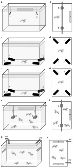 In order to demonstrate the attraction to a food or sulfide odor source, and, eventually, the role of the antennules for this detection, three different experimental setups were tested (Figure 5a–f).
