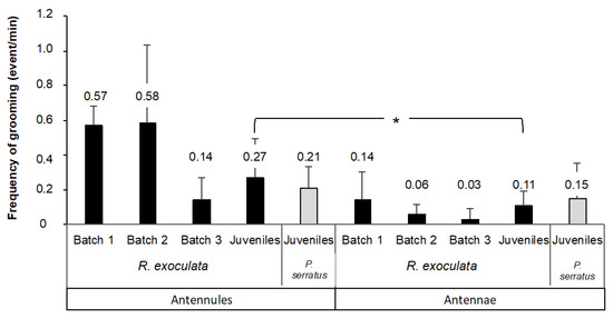 For adults of R. exoculata, behavior was recorded and analyzed for each individual over a duration of 53 min. The time when the heads of individuals were not visible (individuals in swarms, or on the walls of the cage) was deducted for a more accurate estimation of the number of grooming events per minute per individual. For juveniles, the batch of 8 individuals was very active, which made it difficult to track each individual, especially since they often gathered in swarms. A total of 9 observations were therefore made over a period of 17 min on randomly selected individuals. This gives a total observation time of 153 min (9 × 17 min), comparable to the observation time for P. serratus juveniles, which is 159 min (3 × 53 min, see Section 2.3.1).