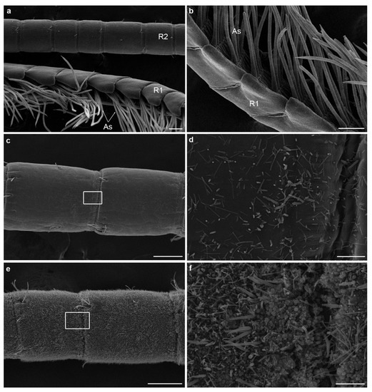In both species, the inter-individual variability is significant, most likely related to the time elapsed since the last molt and the acquisition of a new bacteria-free cuticle. Antennules and antennae show similar fouling patterns. For Palaemon serratus, this ranges from a complete absence of bacteria (Figure 7a,b), through sparse coverage (bacteria are present in low density but relatively homogeneously distributed over the segments, Figure 7c,d), to almost complete coverage of the surface of the antenna and antennule segments (Figure 7e,f). The bacterial morphotypes observed on P. serratus are diverse; they have a very fine filament, filamentous bacteria, rods and cocci (see Figure 7d,f). A few diatoms were also occasionally observed among the bacteria. For Rimicaris exoculata, the same pattern is observed, from a complete absence of bacteria (Figure 8a), through sparse coverage (bacteria are present as a few patches with a high density of rod or filamentous bacteria; Figure 8c), to almost total coverage of the surface of the antennae and antennule segments (Figure 8e for R. exoculata), but also of aesthetascs and non-aesthetascs sensilla (Figure 8b,d,f).