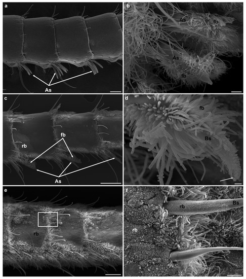 Scanning electron micrographs of Rimicaris exoculata before (Rex1, Rex5) and after (Rex38) grooming experiments. (a,c,e) Antennules of Rex1 (a), and Rex5 (c,e) specimen showing gradation from no, light and high bacterial fouling on the antennal segments; (b,d,f) Antennule of Rex38 specimen showing dense bacterial fouling on the aesthetascs (b) and beaked setae (d,f) (terminology used in [23]) including their terminal pore. In (d) arrow shows the location of the pore covered by rods). Frame in (e) is enlarged in (f), showing the bacterial (rods) mat covering the surface of the segments, the filamentous bacteria (fb) in the inter-segmental areas and the base of a short thin setae, as well as and an intermediate beaked setae covered by rod-shaped bacteria. As: aesthetascs, Bs: beaked seta, fb: filamentous bacteria, rb: rod-shaped bacteria. Scale bars: (a,c,e) = 100 µm; (b,f) = 10 µm; (d) = 2 µm.