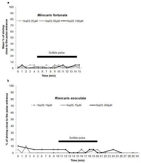A preliminary experiment was carried out during the BIOBAZ cruise to test the attraction to a sulfide emission in M. fortunata (Figure 2 and Figure 4d). A batch of 30 individuals, including 20 adults and 10 juveniles, was placed at in situ pressure in the IPOCAMP aquarium and subjected to a series of 10 min-pulses of 25 to 100 µmol L−1 Na2S solutions (Figure 9a, the results for the juveniles are not presented on the figure). For all the experiments, a maximum of one adult at a time (5% of the adult batch) and one juvenile at a time (10% of the juvenile batch) came in proximity of the sulfide fluid emission. Each experiment was only repeated twice on the same batch of shrimp, which precludes any robust statistical analysis. However, the behavior of the shrimp did not differ during the pulse when compared to the periods before and after the pulse. It can therefore be concluded that the sulfide emissions did not trigger any attraction in M. fortunata in our experimental conditions.