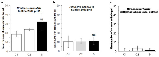 A similar experiment was conducted on R. exoculata during the BICOSE 2014 cruise (Figure 2 and Figure 4d), with a batch of 20 individuals being subjected to a series of 10 min-pulses of 10 to 300 µmol L−1 Na2S solutions (Figure 9b). For all the experiments, a maximum of one individual at a time (5% of the batch) came into contact with the sulfide-diffusing device during the pulse, showing no difference with the behavior observed before and after the pulse. In our experimental conditions, the sulfide emissions did not trigger any attraction in R. exoculata either. To further investigate a possible attraction to sulfide, we tested another setup for R. exoculata in the IPOCAMP aquarium during the BICOSE 2018 cruise at the Mid-Atlantic Ridge (Figure 2 and Figure 4c). Two control gels and one sulfide-loaded gel were consecutively presented to three batches of 10 individuals. An initial experiment was carried out with a 2 mM sulfide gel at pH = 11, and a second experiment with a 2 mM sulfide gel adjusted to pH = 4 for an enhanced release of Na2S (Figure 10a,b, see Section 2 for further explanation). The mean number of times of contact with the control gels and the sulfide-loaded gel was not significantly different between the experiments.