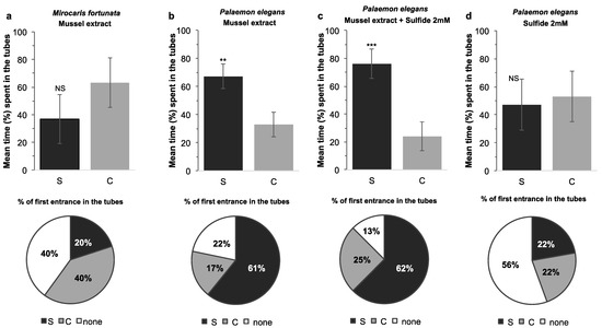 Responses to food and sulfide stimuli during multiple choice experiments on single individuals of Mirocaris fortunata and Palaemon elegans. (a) Mirocaris fortunata. Upper graph (bar chart): mean time (% ± S.E.M.) spent in the tube containing the stimulus odor (S, agarose gel loaded with mussel extract, black bar) and in the 3 control tubes (C, agarose gels, grey bar). The means were compared with a two-tailed t-test (not significantly different, n = 10). (b–d) Palaemon elegans. Upper graphs (bar charts): mean time (% ± S.E.M.) spent in the tube containing the stimulus odor (S, agarose gel loaded with mussel extract ((b), n = 23), mussel extract + sulfide 2 mM ((c), n = 17), sulfide 2 mM ((d), n = 12), black bar) and in the 3 control tubes (C, agarose gels, grey bar). The means were compared with a two-tailed t-test ((b), p = 0.008, ** p < 0.01, significantly different; (c), p = 0.001, *** p < 0.005, significantly different; (d), not significantly different). Lower graphs (pie charts) present the distribution of the shrimp according to their first entrance in the stimulus tube (S, black), a control tube (C, grey) or none (white).
