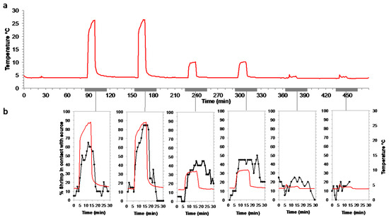Responses to warm-temperature pulses at in situ pressure on a batch of Rimicaris exoculata. (a) Profile of warm temperature pulses. The baseline temperature was set at 4 °C, the first two pulses were set at 25 °C, the next two pulses at 10 °C and the last two pulses at 5 °C, with one hour between each pulse; (b) percentage of shrimp (n = 20) in contact with the diffuser for each pulse. The temperature profile is plotted for each 30 min observation period (symbolized by a grey bar on the temperature profile in (a)). For the last temperature pulse, observations after 15 min are missing due to the poor quality of the video (camera field of view obstructed by shrimp and low light).